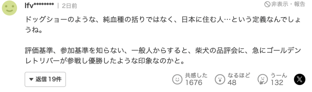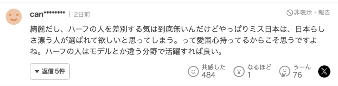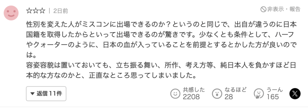 “这样的话,那么那些改变性别的人能参加这种选美吗?同样,出身不同、就算是取得了日本国籍也能参赛,真是令人震惊。至少要将血统作为参赛前提,像拥有一半日本血统、或者四分之一日本血统。不过撇开外表,说实话,我觉得她的言行举止和内在都能打败不少纯种日本人。”
