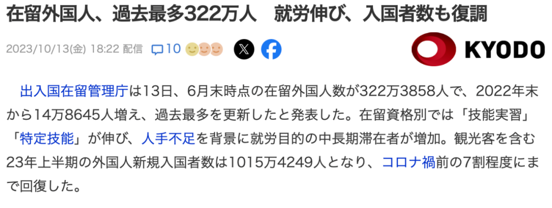 根据日本出入境在留管理厅数据显示,截止到2023年6月末,日本在留外国人为322万3858人,比2022年末增加了14万8645人,创下历史新高。