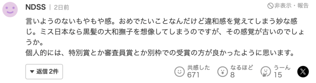 “无法形容的违和感,虽然看到她夺冠还是蛮开心,但是总觉得很奇怪。在我印象中,日本小姐应该就是那种黑发的大和抚子日式美人。这种想法会很过时吗?我觉得让她拿一些特别奖比较妥当。”