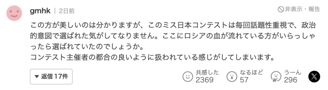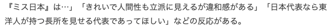 “日本小姐每次都只重视话题性,感觉椎野只是因为政治正确而被选中。如果她是拥有俄罗斯血统的人,会被选中吗?”