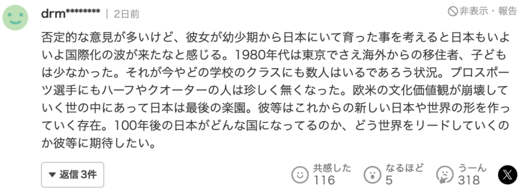 “即便有很多负面评价,不过想到她从小就在日本长大,感觉日本也终于迎来了国际化的浪潮,回想上世纪80年代,即便在东京,国外的移民和孩子也挺少见的。不过现在每个班级里都会有那么几个来自国外的孩子。
