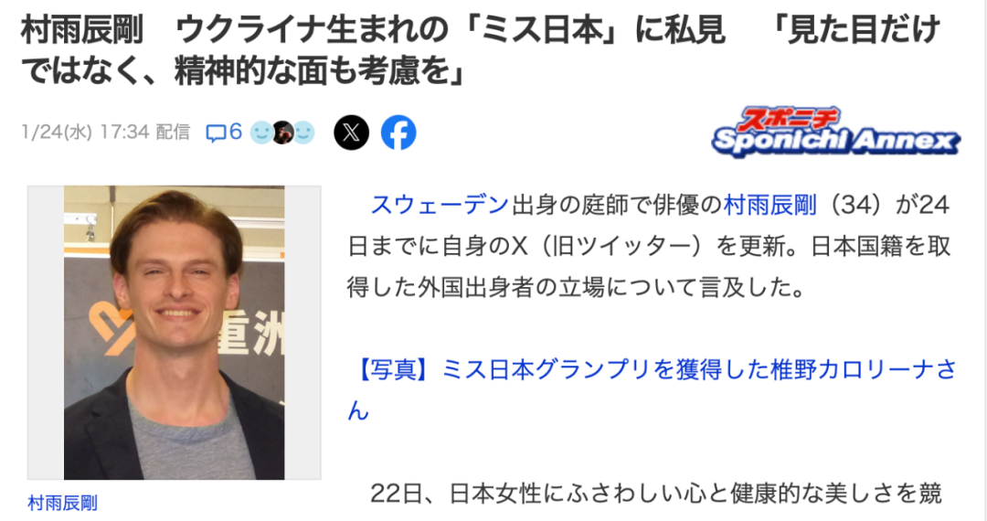 对此,同样也是归化日本人的瑞典裔演员村雨辰刚表示,如果认为归化日本人代表不了日本的话,那么最终吃亏的是日本。