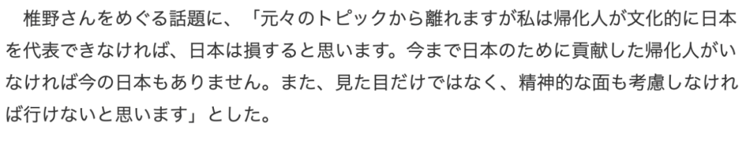 他们认为,时代变了,日本人要放下昔日“保守排外、心胸狭窄”的缺点,应该要包容多样性。既然椎野拥有正式的日本国籍,那么她就是日本人、就能代表日本。因为日本的未来,也得依靠这些归化的日本人。