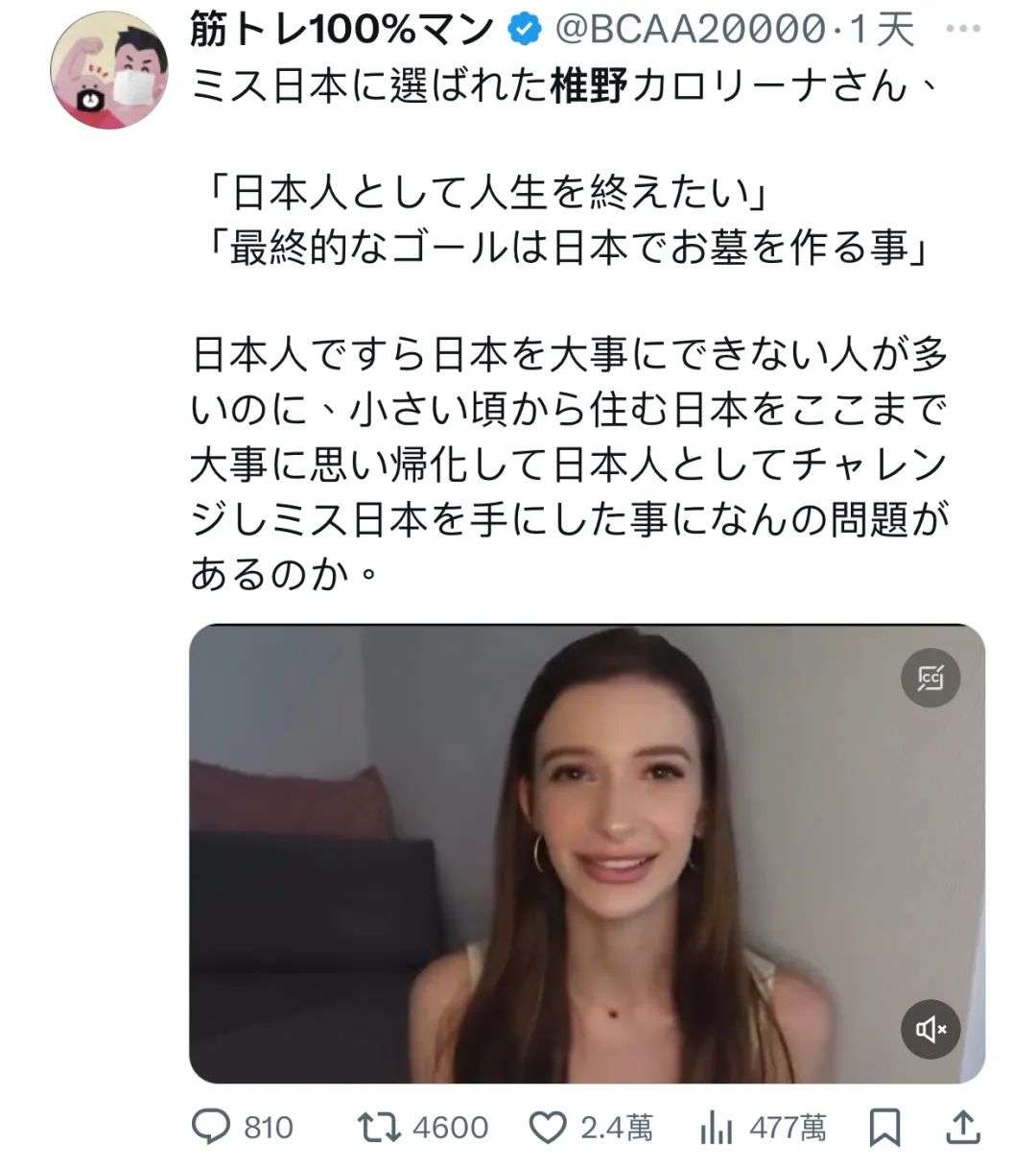 更多日本人直接破防。他们普遍表示,西方长相、毫无日本血统的人是无法代表日本的。看见一个金发碧眼的女性夺冠“日本小姐”,确实很违和。