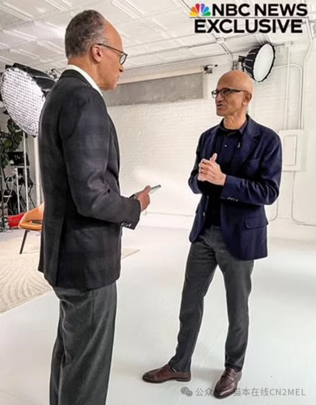 Satya Nadella将于周二与Lester Holt一起出现在 NBC 晚间新闻中,根据该频道发布的采访摘录,这些图像是使用AI创建的,令人不安。