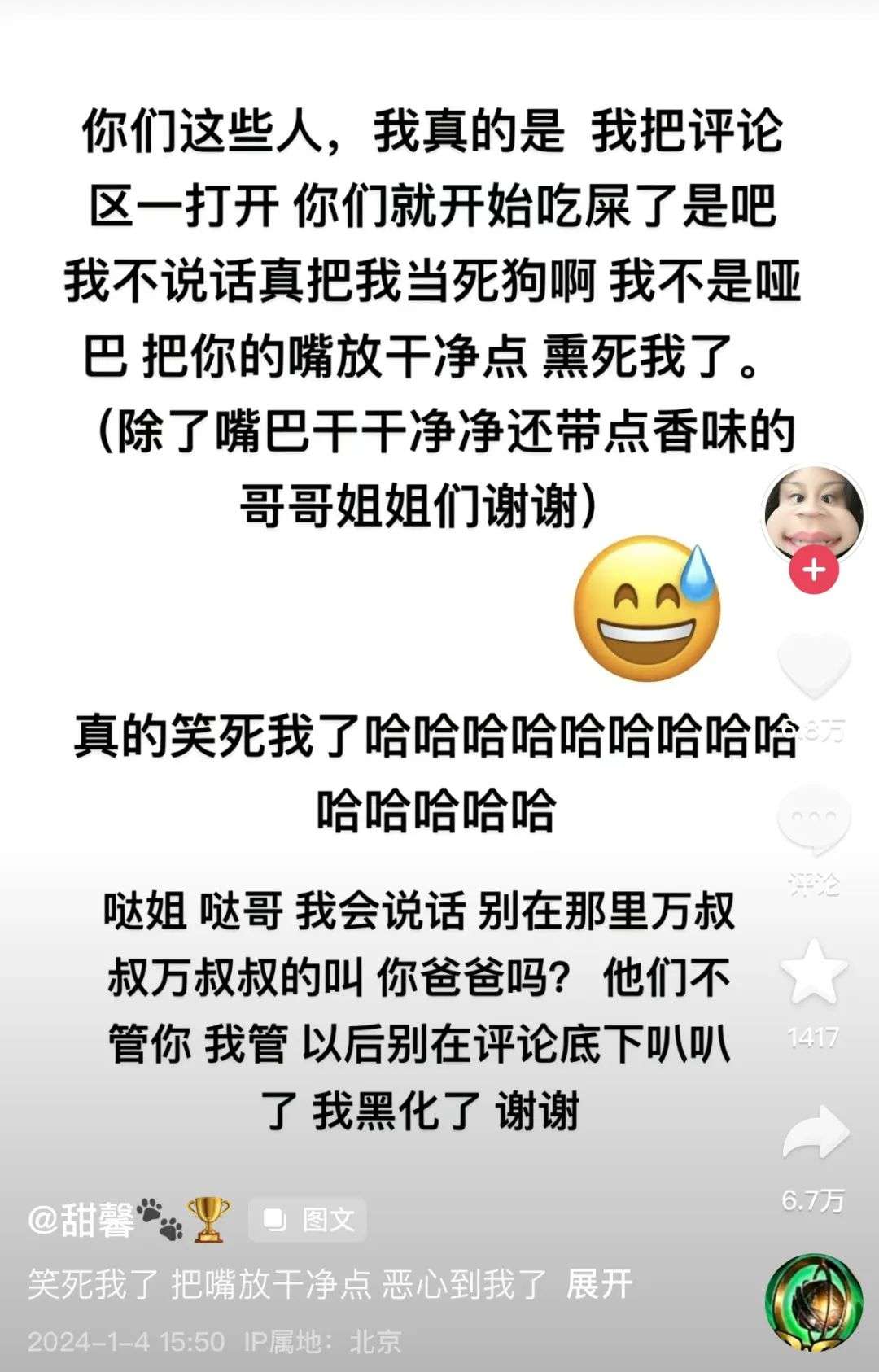 不解气的甜馨干脆又发了一篇文字,明确表明自己绝不是任人恶意拿捏、调侃的委屈受气包,直接开喷:嘴巴放干净点,恶心到我了。我黑化了,谢谢。
