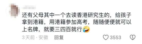 “父母其中一个去读香港研究生,给孩子拿到港籍,用港籍参加高考,随随便便就可以上名校,只要三四百分就行。”