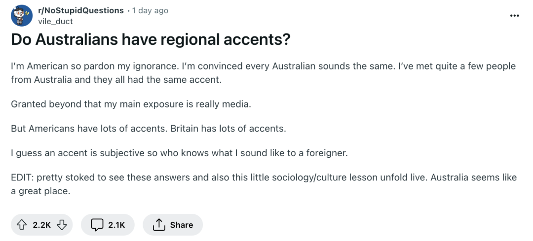 网友@vile_duct发帖问道,“澳大利亚人有地方口音吗?”,此帖发布不到一天就获得了两千多条评论。