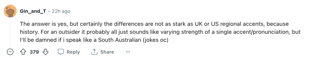 除了对昆州口音的讨论,网友@Gin_and_T还从更广泛的角度解释了这一点,“澳洲肯定是存在口音的,但由于历史原因,差异肯定不如英国或美国的地方口音那么明显。”