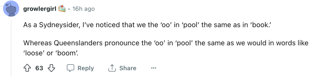 “作为一个悉尼人,我注意到我们把‘pool’中的 ‘oo’发音和‘book’中的‘oo’发音一样。”