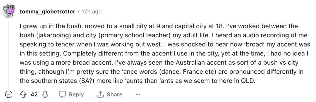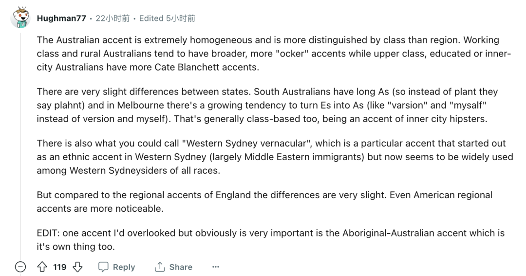 网友@Hughman77解释道,“澳大利亚口音极为单一,更多的是按阶级而非地区来区分。”