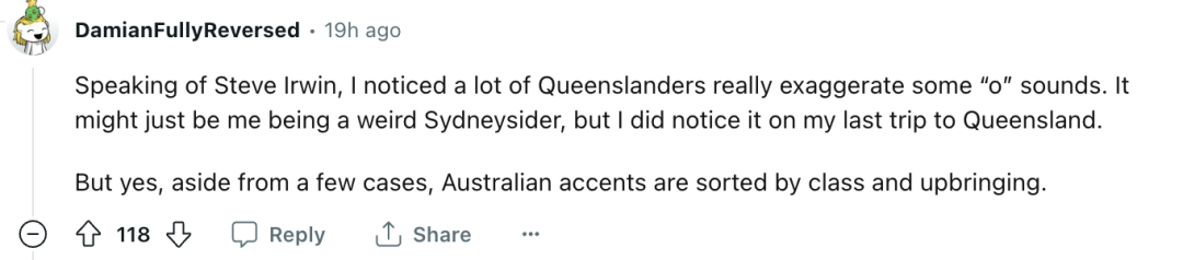 网友@DamianFullyReversed评论道,“说到Steve Irwin(曾在昆士兰生活),很多昆士兰人真的会夸大一些‘o’的发音。”