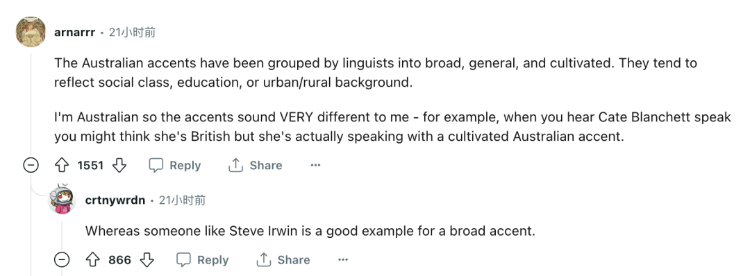 下面的另一位网友@crtnywrdn补充道,“而Steve Irwin(澳洲主持人)则是重口音的一个例子。”