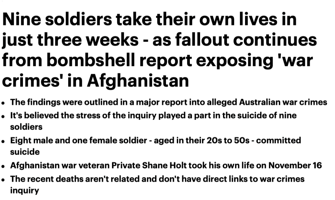 在调查报告公布后不久,就有9名澳大利亚士兵(一名女性,八名男性)在短短三周内相继自杀。
