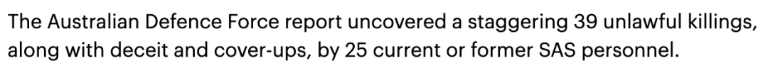 调查发现,25名澳大利亚特种部队的士兵在23起事件中非法杀死39名阿富汗人,涉事人员大多来自特种空勤团。