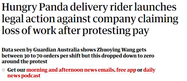 对于这个结果她无法接受,澳洲法律明令禁止这样的行为,而且她只是希望联合同胞索取更多安全保障。于是她决定将熊猫外卖起诉到公平工作委员会。
