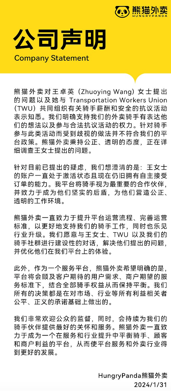 最终,熊猫外卖发布官方声明:表示愿意和Zhuoying Wang以及运输工人工会进行有建设性的对话!