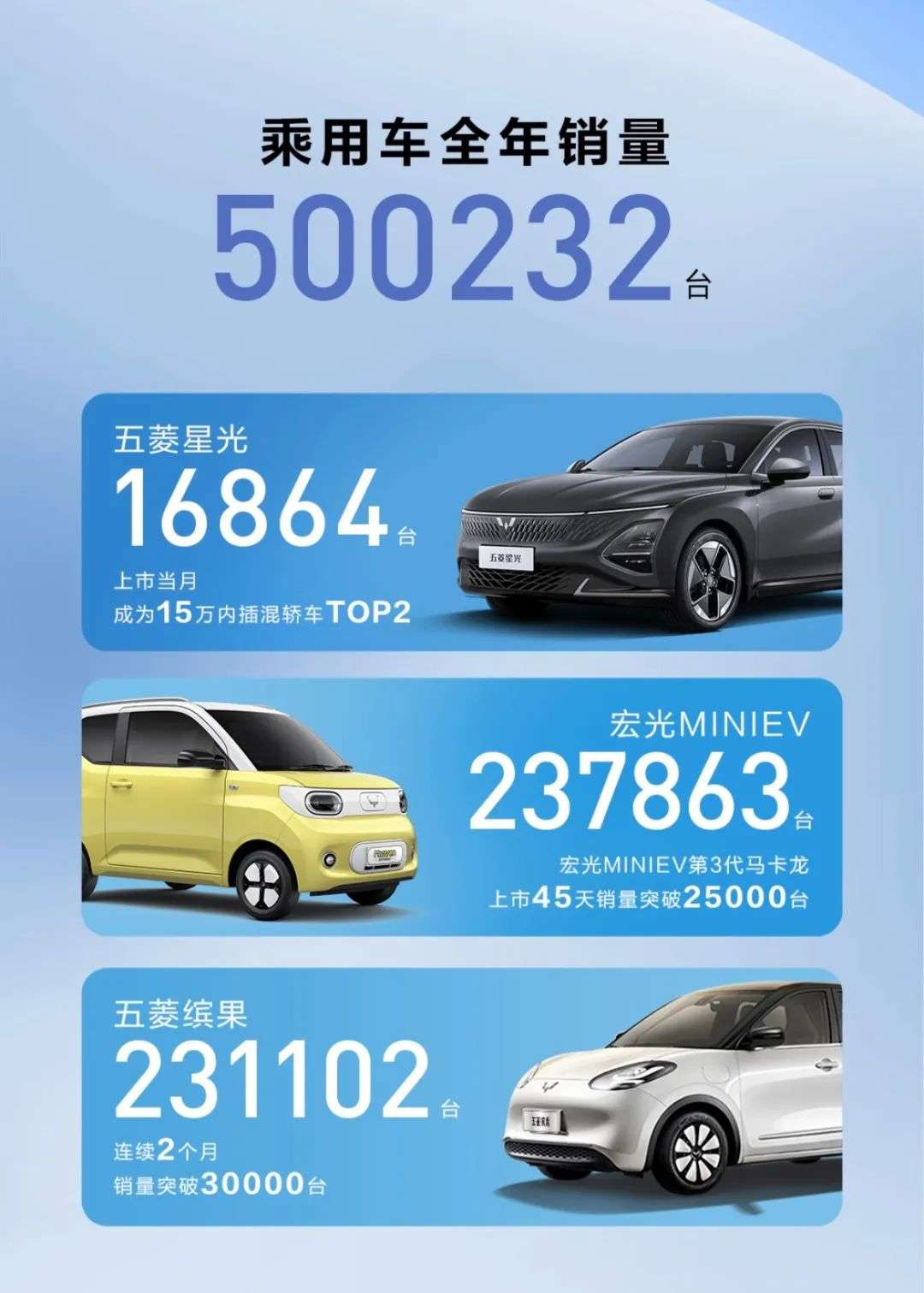 数据显示,2023年上汽通用五菱全年汽车销量达140.3万辆,五菱缤果、宝骏悦也、宝骏云朵、五菱星光等11款产品投产,新车型全年贡献销量超37万辆。尤其是2023年推出的五菱缤果、五菱宏光MINI第三代马卡龙、五菱星光三大爆款,单车价值提升16%。