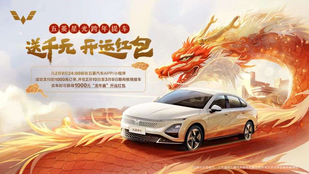 值得注意的是,上汽通用五菱还针对2月9日24:00前在五菱汽车APP或小程序成功支付的1000元订单且在2月10日~3月9日之间提车的用户,交车时将由经销商给用户发放1000元的“龙年赢”开运红包,补贴春节期间的通勤费用。