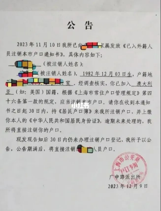 不过最近有一名网友晒出了一张通知,由于已经移居海外并且入籍澳洲,派出所直接发信告知注销户口!