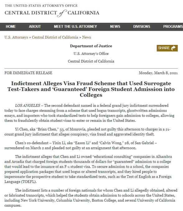 同年3月,美国联邦司法部再次逮捕两名华裔留学中介,他们被指控串谋、签证欺诈和严重身份盗窃等21项罪名,最高刑期17年以上。