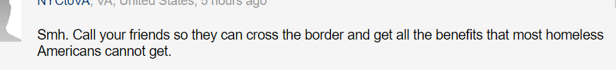 “给你国外的朋友打个电话,这样他们就可以越过边境,获得大多数无家可归的美国人都无法获得的所有福利哦。”