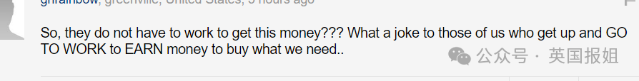 “不用工作就能拿钱是吧?我们这些每天起床上班挣点钱养活自己的人宛如一个笑话。”