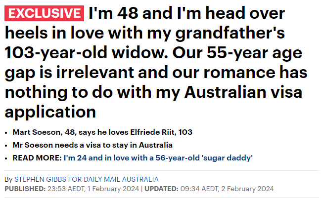 收藏和爷爷遗孀恋爱, 48岁欧洲男子爱上103岁澳洲老太! 男方申PR遭拒