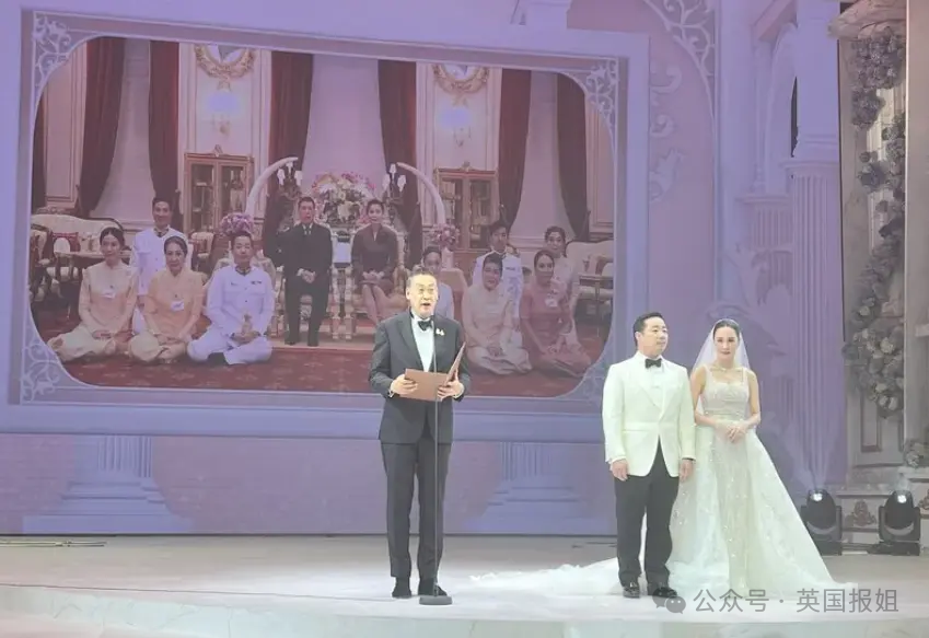 婚礼上,泰国总理上台讲话,后面大屏幕上放了泰王、苏提达皇后和这对新婚夫妇的照片。
