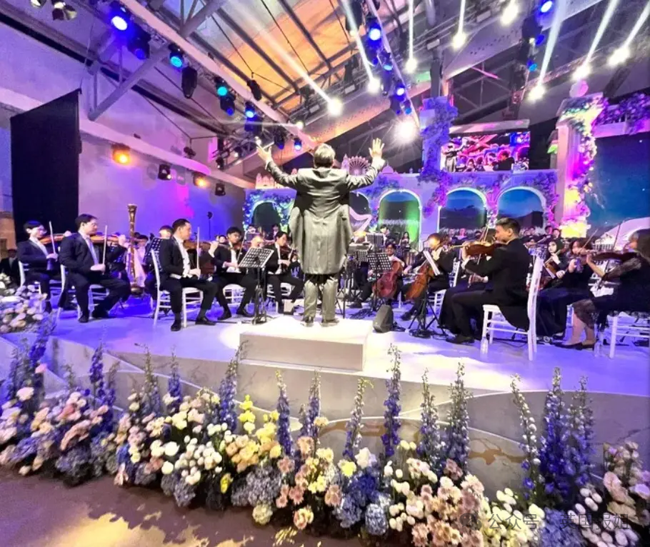 正式婚礼仪式的舞台更是布置得美轮美奂,除了鲜花之外,灯光、舞美都是顶级的,还请了交响乐团。