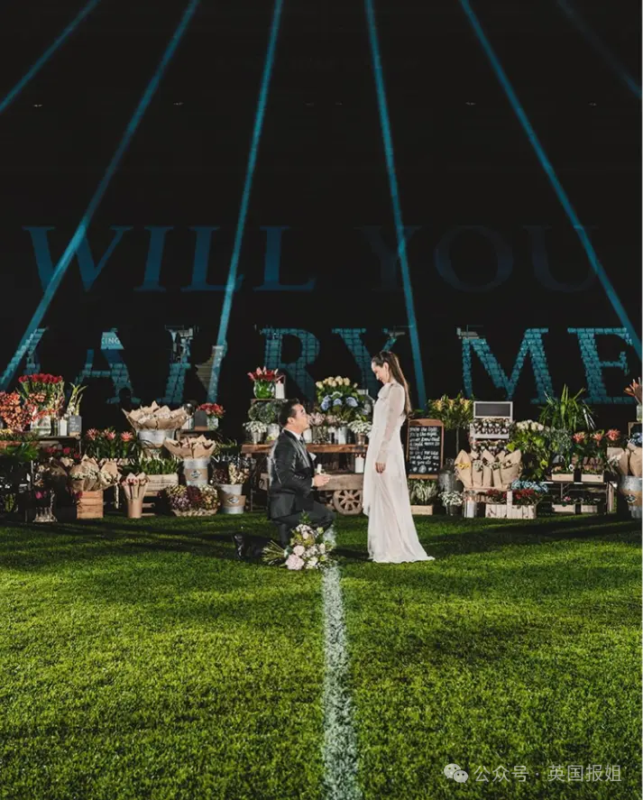 去年10月24日,英国王权体育场被清场关闭,球场上装饰着无数鲜花和绚丽烟火,徐盛源在这里准备了精致唯美的求婚场景,当绚烂的烟花响起时,徐盛源单膝跪地向女友求婚,对方当然感动地答应了。