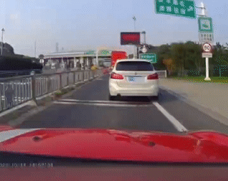 这样危险又嚣张的行为,哪个开车的都不会惯着,于是两车齐头并进,一直开到了接近入口处。