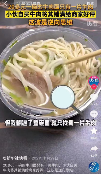 一个小伙子在外卖平台点了一碗20元的牛肉拉面,外卖送到后,却发现面里仅有一片牛肉。