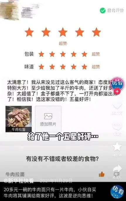 结果他这么一评论,很多顾客下单以后,发现拿到的牛肉面和五星好评牛肉面完全不一样,一下子涌入很多差评,店家生意一落千丈。