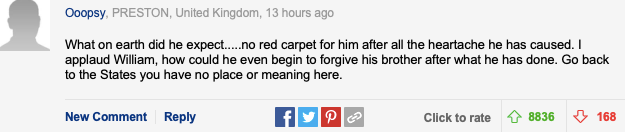 “哈里到底在期待啥…在他造成了那么多伤痛之后,他还渴望家人用红地毯迎接他?我为威廉鼓掌,在哈里做了这么多伤害家人的事情后,他怎么可能原谅他?滚回美国吧,哈里,你在这里没有地位,也没有意义。”