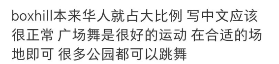 “Box Hill本来华人就占大比例,写中文应该很正常,广场舞是很好的运动,在合适的场地即可,很多公园都可以跳舞。”