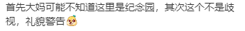 “首先大妈可能不知道这里是纪念公园,其次这个不是歧视,是礼貌警告。”