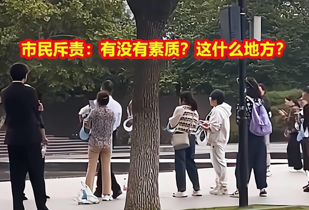 从视频截图中也可以看到,这些大妈摆出了“阿姨拍照经典姿势”,欢欢喜喜地比着“耶”,跟现场庄重肃穆的氛围格格不入。
