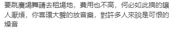 “要跳广场舞请去租场地,费用也不高,何必如此搞得让人讨厌,你喜欢大声地放音乐,对许多人来说是可恨的噪音。”