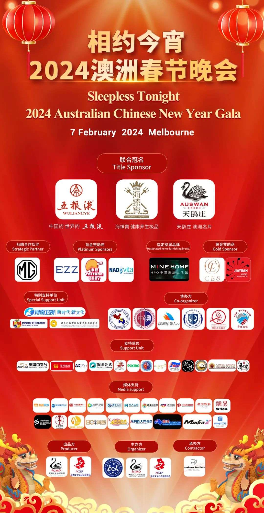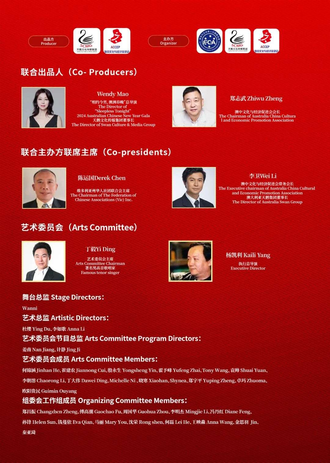这场春晚由天鹅文化传媒、澳中文化与经济促进会出品,墨尔本站由维州华人社团联合会,天鹅文化传媒集团、澳中文化与经济促进会联合主办,五粮液、海臻宝、AUSWAN CREEK天鹅庄联合冠名,Wendy Mao担任总导演,中国中央广播电视总台大型节目导演杨凯利担任执行总导演、世界著名男高音歌唱家,前悉尼歌剧院首席男高音、现中国中央音乐学院声歌系教授、博士生导师丁毅教授为艺术委员会主席。