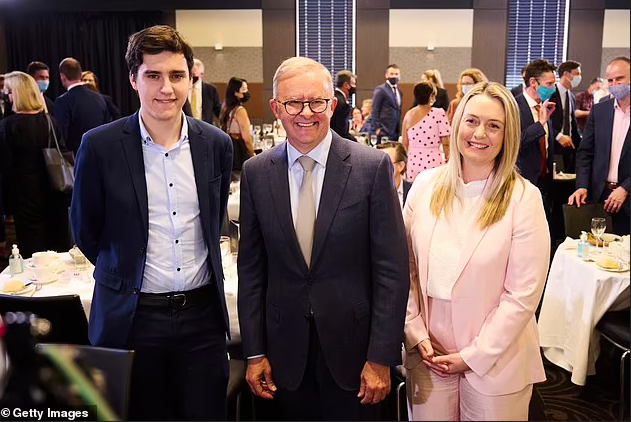 用餐结束后,他们回到了住处,艾博年向Jodie求婚,收获了肯定的答复。他们在一份联合声明中表示:“我们很高兴能分享这个消息,并期待着一起度过余生。”订婚的消息公布后,包括澳外长黄英贤、内政部长Clare O‘Neil、财长Jim Chalmers在内的多名澳洲政要也送上祝福。澳总理艾博年现年60岁,此前也有一段长达19年的婚姻生活,前妻为曾任新州副州长的Carmel Tebbutt。(左一为艾博年的儿子Nathan,右一为Jodie Haydon)艾博年和Jodie Haydon则是在2020年的一次晚会上相识,当时艾博年还是反对党党魁。当时,艾博年询问人群中是否还有南悉尼队的球迷在场,Jodie Haydon大喊了一声:“兔子们(南悉尼的橄榄球队叫做南悉尼兔子队)起来吧。”于是,两人因橄榄球相识,并决定回到悉尼后一起喝酒。 “我们在Newtown的Young Henrys喝了一杯,我当时以为只是去喝一杯,我们相处得很好。事情就是这样开始的。”艾博年表示。Jodie Haydon出生于悉尼西部的Bankstown,父母都是学校教师。她没有读完大学,后来从事养老金相关的工作,如今在新州公共服务协会(NSW Public Service Association)任职。她表示,一开始她不是想谈恋爱,但当2021年,艾博年发生车祸,险些丧命时,她意识到自己爱上了他。