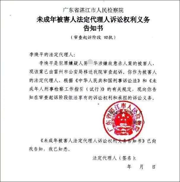 2024年2月6日,李海玉透露,她接到当地检方的电话通知,说易某华因涉嫌故意杀人已经被批准逮捕。2月14日,李海玉收到广东湛江市雷州市检察院作出的《被害人诉讼权利义务告知书》显示,犯罪嫌疑人易某华故意杀人案一案,雷州市公安局于2024年2月6日向雷州市检察院移送起诉。湛江市检察院于2月7日作出的《未成年被害人法定代理人诉讼权利义务告知书》显示,李某平是犯罪嫌疑人易某华涉嫌故意杀人案的被害人,现该案已由雷州市公安局移送湛江市检察院审查起诉。