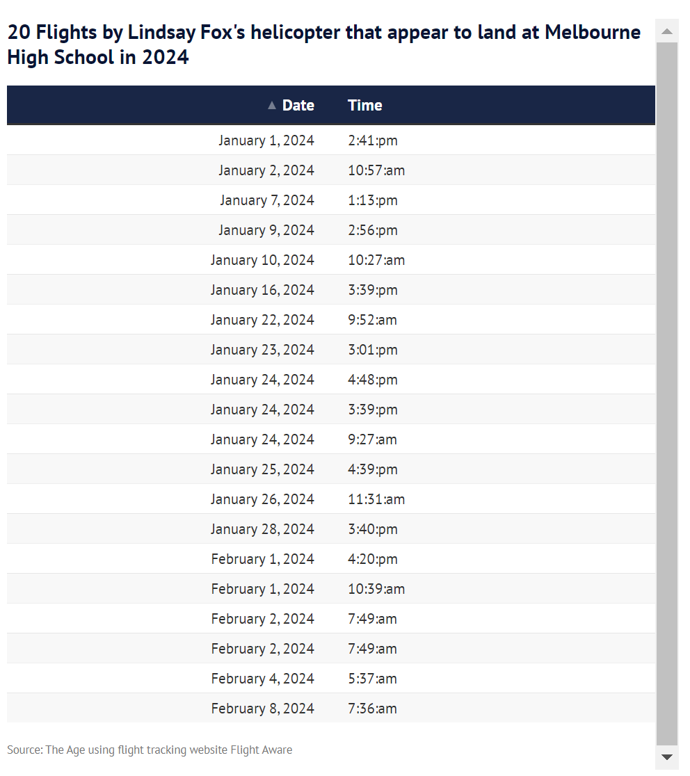 虽然Melbourne High的直升机起降没有官方飞行记录,但通过跟踪林赛的直升机经过政府大楼和Richmond的数据显示,自1月1日以来,它至少已经在学校操场降落了20次。