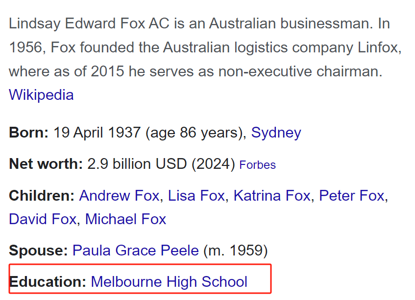 反正林赛直接就跟Melbourne High说了,有了前校友这层关系,加上我给你捐个奖学金吧,一年$3000的Lindsay Fox奖学金,该奖学金由Melbourne High基金会管理,用于支付学校杂费、书籍和制服费等。