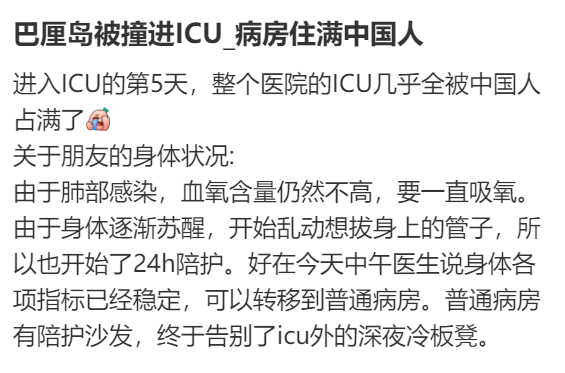 有网友在小红书发帖表示,朋友出了交通事故被撞进了ICU,进医院陪护几天后发现,整个医院的ICU都快被中国人给沾满了。