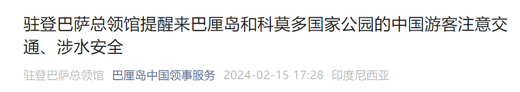 春节假期期间,印尼巴厘岛和科莫多国家公园发生多起涉中国游客交通及溺水事故,造成多名中国游客伤亡,总领馆深感痛心和惋惜。为减少此类事故发生,中国驻登巴萨总领馆再次提醒计划来巴厘岛、科莫多国家公园的中国游客: