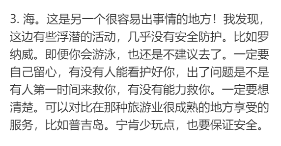 一位在巴厘岛旅游经验较为丰富的网友在小红发帖提醒人们,巴厘岛的旅游服务行业事实上并不成熟,部分商业服务安全意识不足,比如水中项目追海豚、浮潜等。