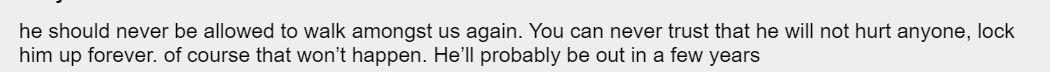 “永久关押吧,这种人真的不能再放到社会上了,只要他还能在外面晃悠那肯定还会伤害到别人。