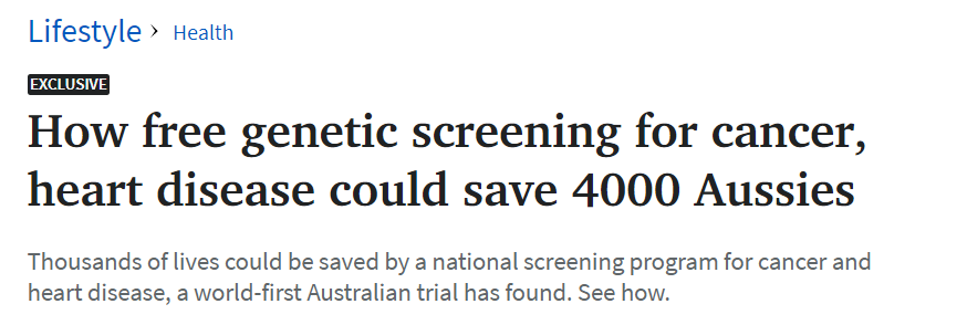 因为据研究人员表示,该基因检测最终的目标是启动一个全民基因筛查计划,由澳大利亚公共医疗系统提供资源,让每个人都可以参与到其中来。