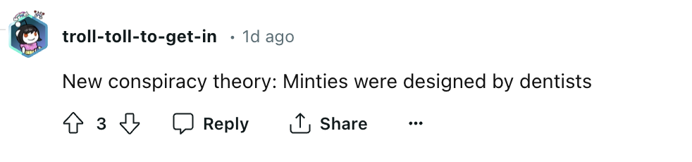 此时一位幽默的网友路过,“新型阴谋论,这种薄荷糖是牙医设计的...”